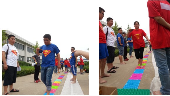 “心有靈犀”結(jié)束后,藍(lán)隊(duì)紅隊(duì)穿好隊(duì)服轉(zhuǎn)戰(zhàn)到戶外,大家的激情遠(yuǎn)遠(yuǎn)超過(guò)了戶外天氣的熱度。主持人剛剛講解完比賽規(guī)則,大家就投入到了比賽活動(dòng)中,一個(gè)個(gè)隊(duì)員光著腳板在指壓板上快速前進(jìn),手上還小心翼翼的用乒乓球拍端著乒乓球,眼睛目不轉(zhuǎn)睛的盯著球拍上的乒乓球,臉上用各種表情來(lái)表達(dá)腳板的感覺(jué)和對(duì)球拍上乒乓球的關(guān)注。每個(gè)隊(duì)員都成功的端著球走過(guò)了指壓板,大家熱烈地討論并分享著自己的感受。