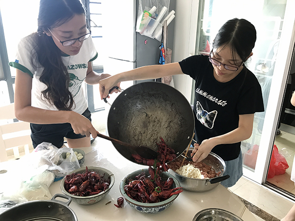 大廚們陸續(xù)到場(chǎng),不一會(huì)廚房?jī)?nèi)就已經(jīng)熱火朝天,洗菜、切菜,忙得不亦樂(lè)乎。很快的,第一道熱菜就下鍋了,第一道熱菜是小云做的十三香小龍蝦,只見她用刷子 把小龍蝦仔仔細(xì)細(xì)刷了一遍,最激動(dòng)人心的就是下鍋的那一刻了,爆香蔥姜后再把小龍蝦倒進(jìn)鍋里,頓時(shí)發(fā)出“呲啦”的聲音,快速翻炒小龍蝦,沒(méi)過(guò)多久就陣陣飄 香,小龍蝦的香味讓同事們的饞蟲都被勾出來(lái)了。