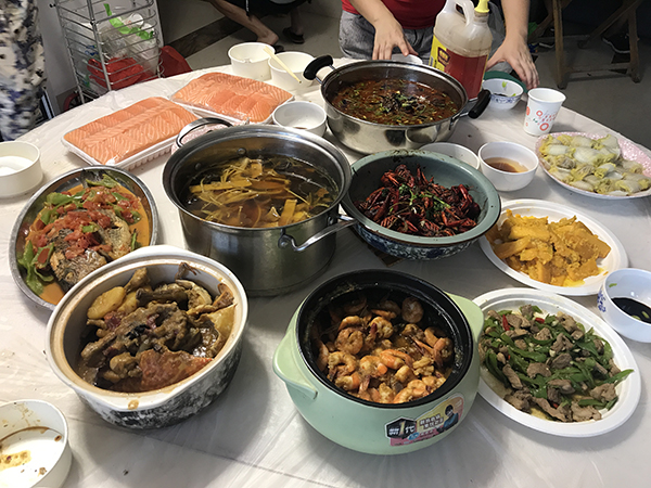 沒(méi)想到平時(shí)工作能力杠杠的同事們,做起菜來(lái)也絲毫不遜色。沒(méi)過(guò)多久菜已經(jīng)陸續(xù)上桌,有毛毛做的紅燒魚與水煮牛肉,米粒做的菜包釀、咸蛋炒南瓜;陶大神做的 佛跳墻、蟹黃煲、椰香蝦;潤(rùn)姐的燒鴨、西芹紅椒炒白果、涼拌木耳;寧寧的炒花甲螺;振宇做的青椒炒肉;芳芳的芒果西米露。一大桌菜色香味俱全、品種多樣, 飯前涼菜、家常炒菜、營(yíng)養(yǎng)豐盛的大菜以及飯后甜點(diǎn)應(yīng)有盡有。
