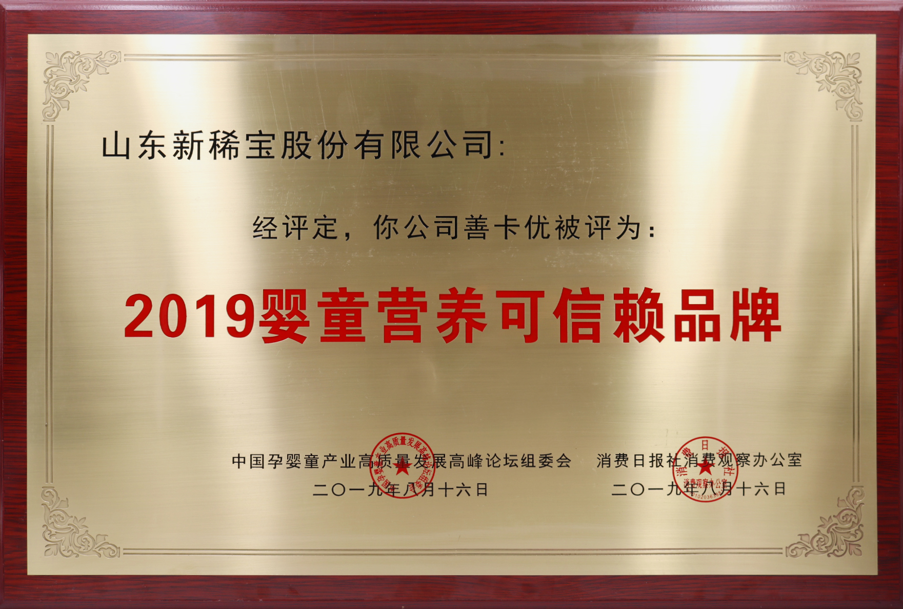 2019年8月 “善卡優(yōu)”被消費(fèi)日?qǐng)?bào)、中國(guó)孕嬰童產(chǎn)業(yè)高質(zhì)量發(fā)展高峰論壇組委會(huì)評(píng)為“2019嬰童營(yíng)養(yǎng)可信賴品牌”