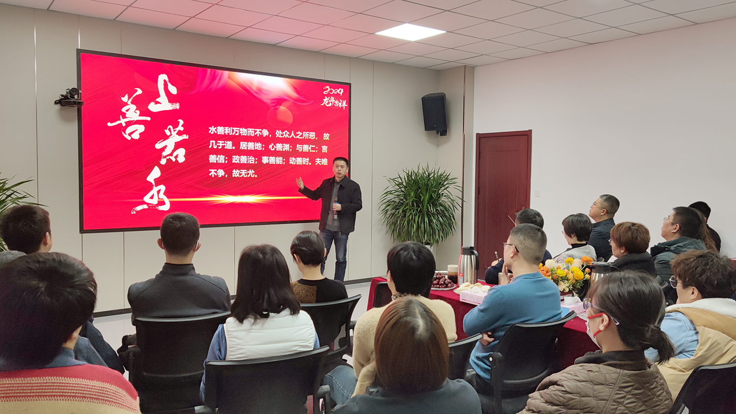 “看了2023財(cái)年的業(yè)績,我為大家的成績感到自豪。”集團(tuán)董事長王猛也對員工的工作成果表示肯定。接著王猛從《老子》的“上善若水”為出發(fā)點(diǎn),詳細(xì)講解了“水善利萬物而不爭,處眾人之所惡,故幾于道。居善地,心善淵,與善仁,言善信,政善治,事善能,動善時(shí)。夫唯不爭,故無尤。”所蘊(yùn)含的生活哲學(xué),并融合實(shí)際生活和工作,向大家傳授了如何從心出發(fā),做到知行合一,激發(fā)自己的更大的潛力。